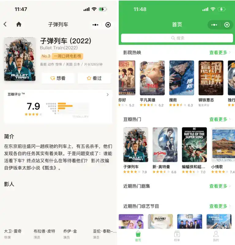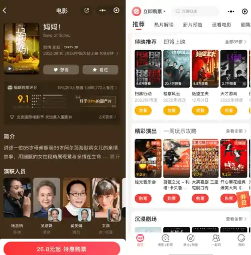 Users can check the latest movies showing in their city with detailed information about movies, cinemas and reviews. They can book tickets directly from the mini program and share an update to their WeChat friends. Users can bookmark the movies they want to watch or have already watched.